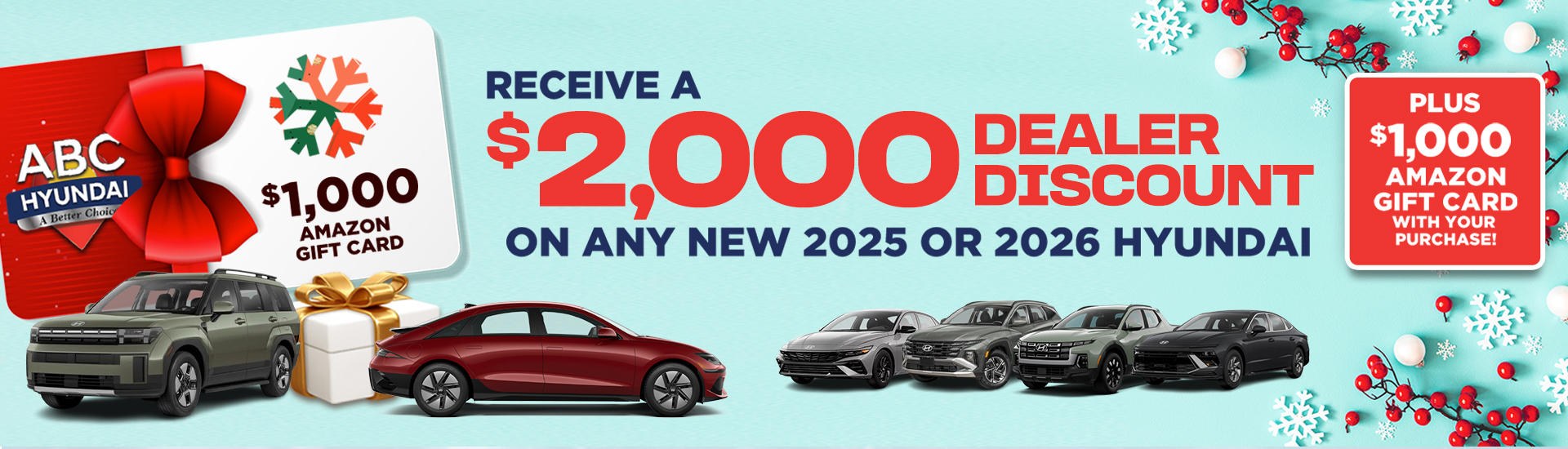 Celebrate the season with a little extra cheer! For a limited time, you can take $2,000 OFF any new 2025 or 2026 Hyundai and enjoy a smoother, brighter drive into the new year.
